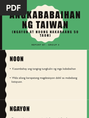 Malaki ang pagkakaiba ng mga kababaihan noon at ngayon. Sa concepto ng pagdadamit kilos at posisyon sa lipunan. Ang Kababaihan ng Taiwan Ngayon at Noong Nakaraang 50 Taon Isinalin sa Filipino ni Sheila C.