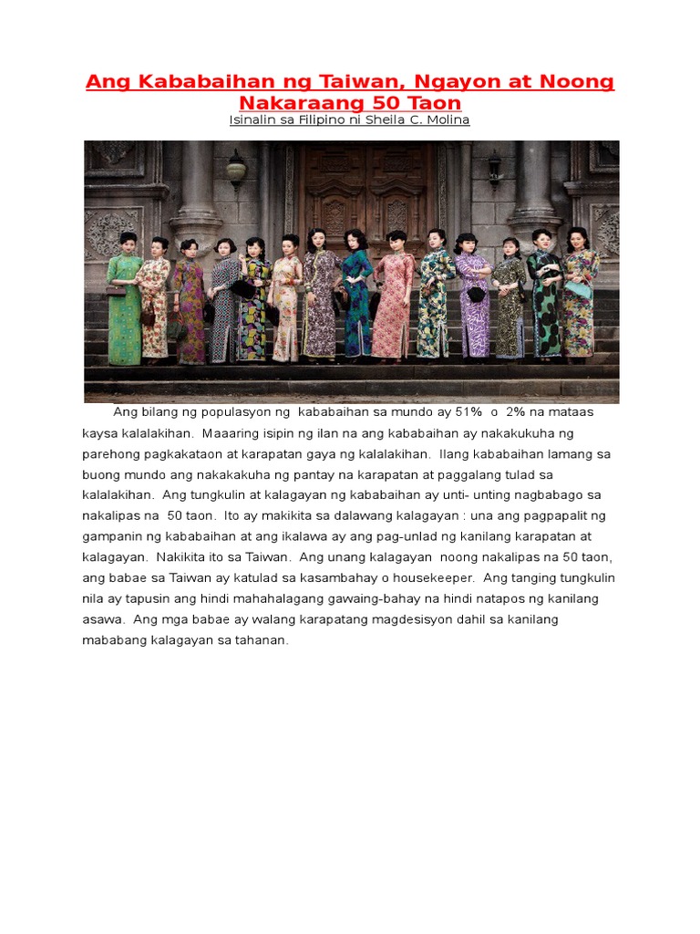 Ang kababaihan ng taiwan noon at ngayon ay isinalin ni. Ngayon at sa Nakalipas na 50 Taon Isinalin sa Filipino ni. Double click to editDouble click to editkababaihan ng taiwangawa ni. Ang bilang ng populasyon ng kababaihan sa mundo ay 51 0 2 na mataas kaysa kalalakihan.