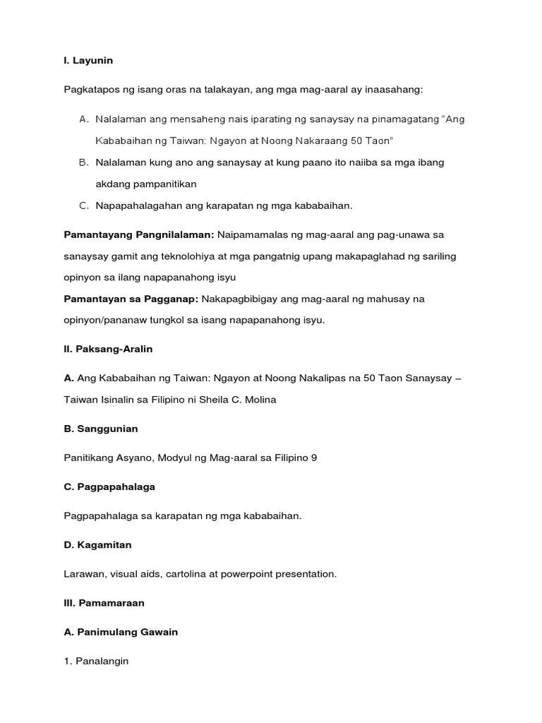 Study Aralin 3 Ang Kababaihan ng Taiwan at Pilipinas. Ito ay isang genre o sangay ng panitikan na nasusulat sa anyong tuluyan na maaring tumalakay sa anumang isyu sa kapaligiran maging tao hayop pook pangyayari bagay at. Ang isa pang akda ay pinamagatang Pagbibigay Kapangyarihan sa Kababaihang Pilipino sa Pamamagitan ng Estadistikang Kasarian.