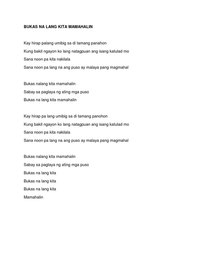 Bukas nalang kita mamahalin Sabay sa paglaya ng ating mga puso Bukas na lang kita mamahalin. From professional translators enterprises web pages and freely available translation repositories. Thanks harsh words just passed i just talked.