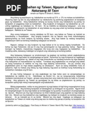 Alamin Dito Hindi naman lahat ng babae ngayon ay may mga katangiang binabanggit sa ibaba. Ang Kababaihan ng Taiwan Ngayon at Noong Nakaraang 50 Taon Ang tungkulin at kalagayan ng kababaihan ay unti-unting nagbabago. Malaki ang pagkakaiba ng mga kababaihan noon at ngayon.